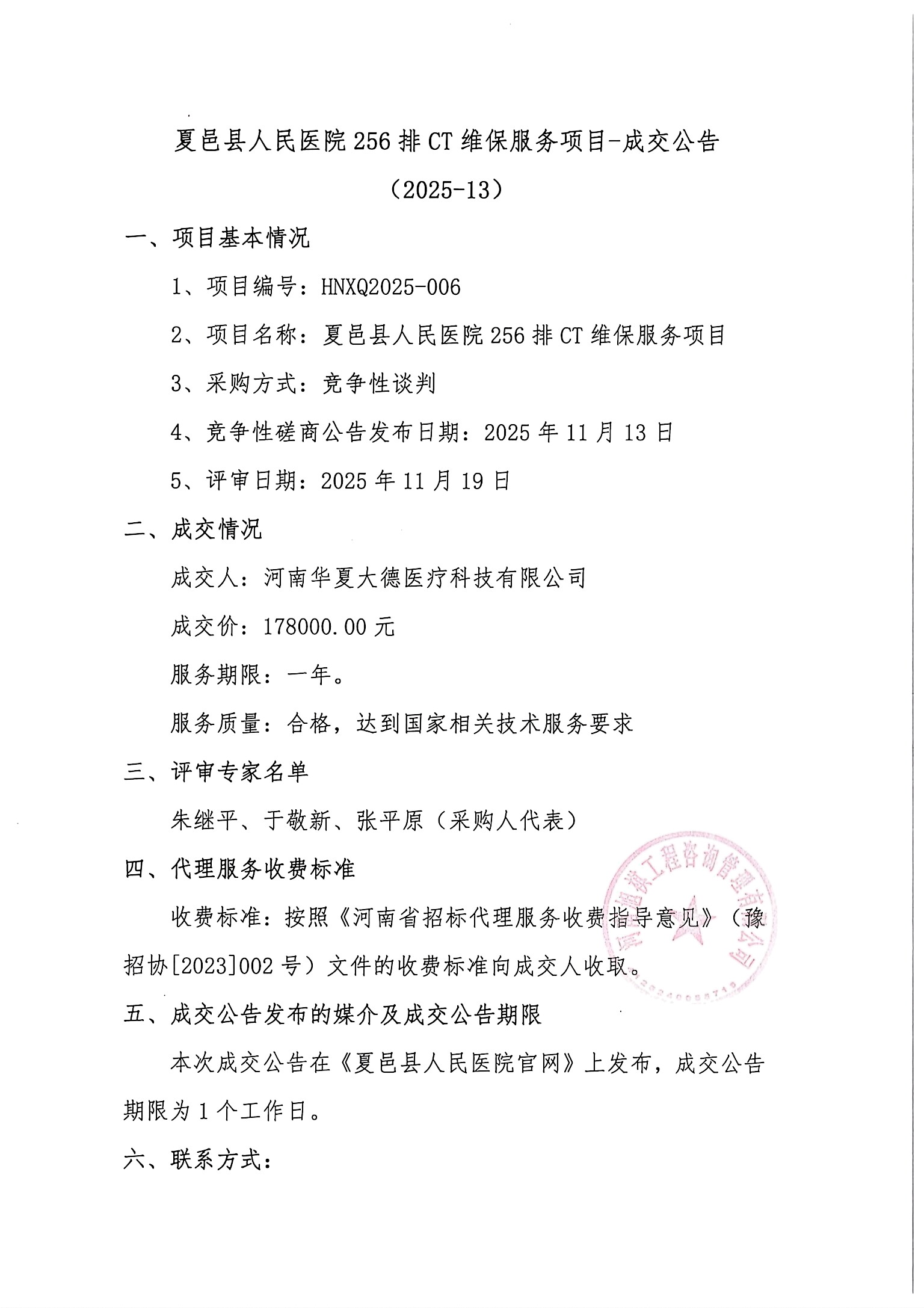 夏邑县人民医院256排CT维保服务项目-成交公告 (2025-13)