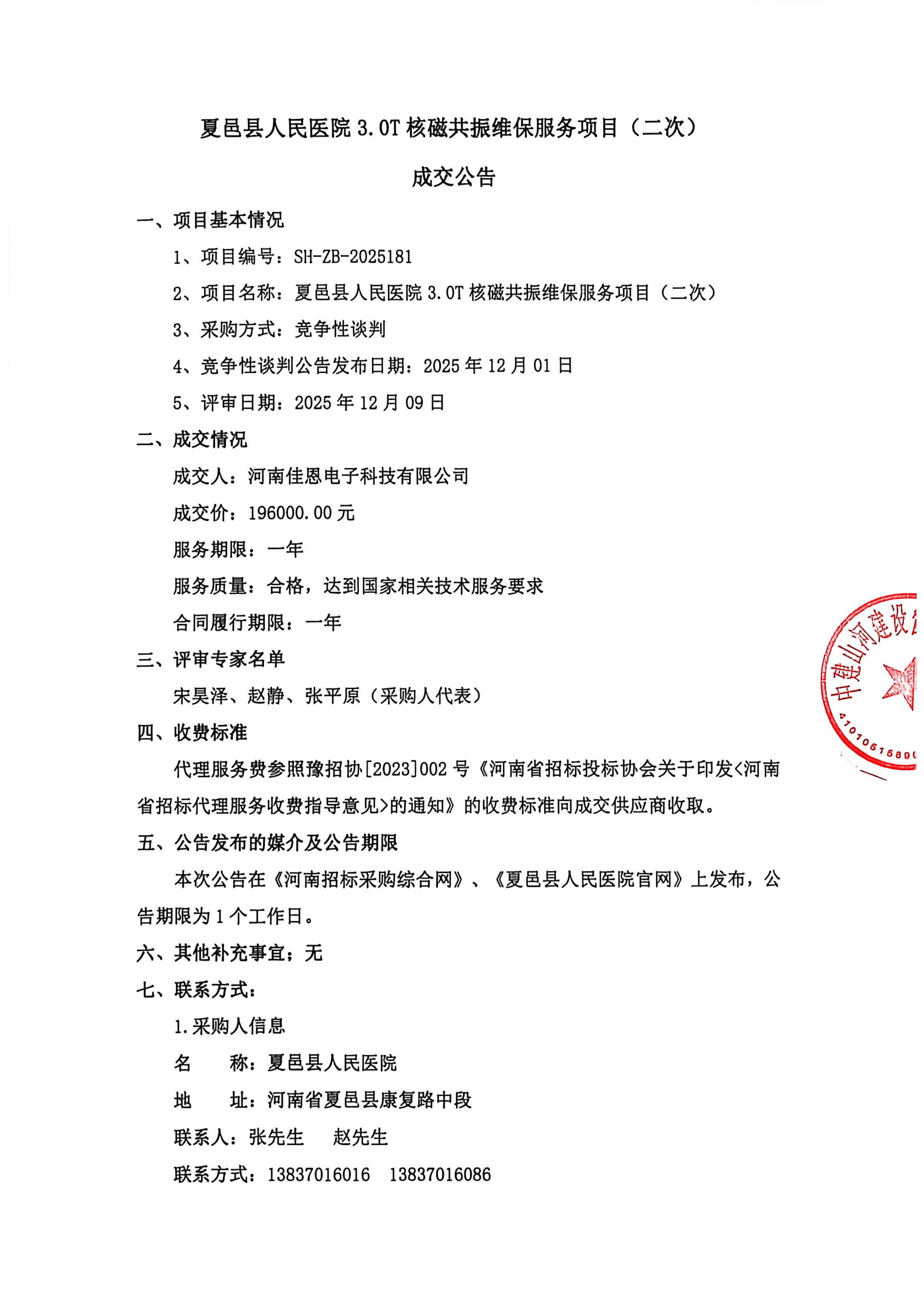 夏邑县人民医院3.0T核磁共振维保服务项目(二次)成交公告