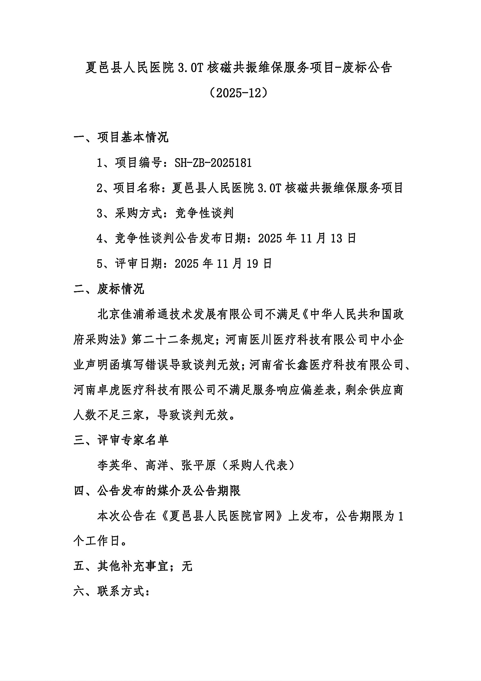 夏邑县人民医院3.0T核磁共振维保服务项目-废标公告 (2025-12)